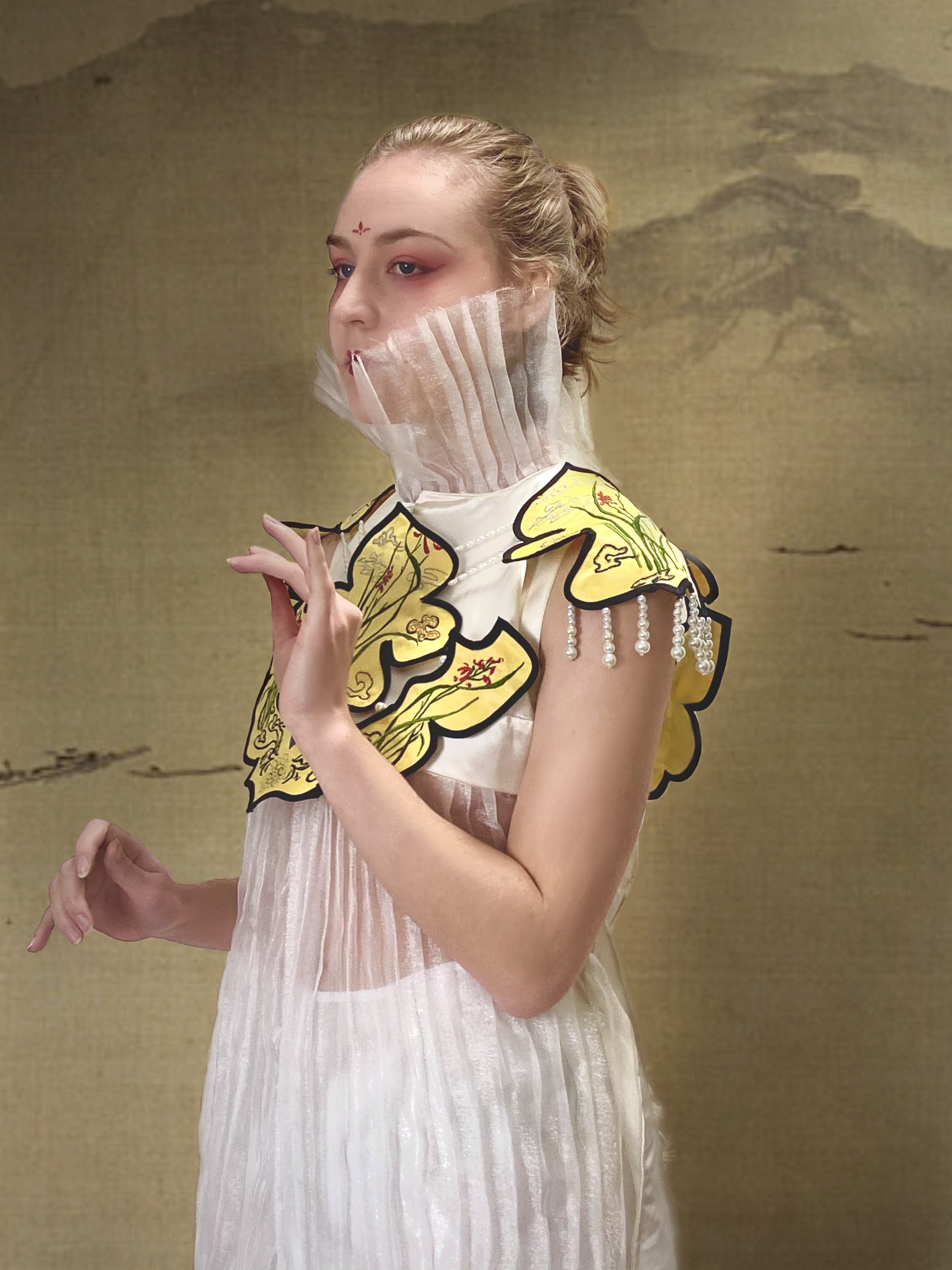 This collection, incorporates my in-depth investigation of Chinese traditional musical instruments and the study of their history and culture. In my creations, every piece of clothing represents a specific musical instrument. My desire is to spread and popularize Chinese traditional national musical instruments and techniques. As well, I bridge time-honored Chinese embroidery techniques with western aesthetics in my garment patterning and silhouettes, asking viewers to slow down and examine the details. My design reflects a strong opinion- that the continuation of history and culture depends on constant propaganda and inheritance from generation to generation to last.